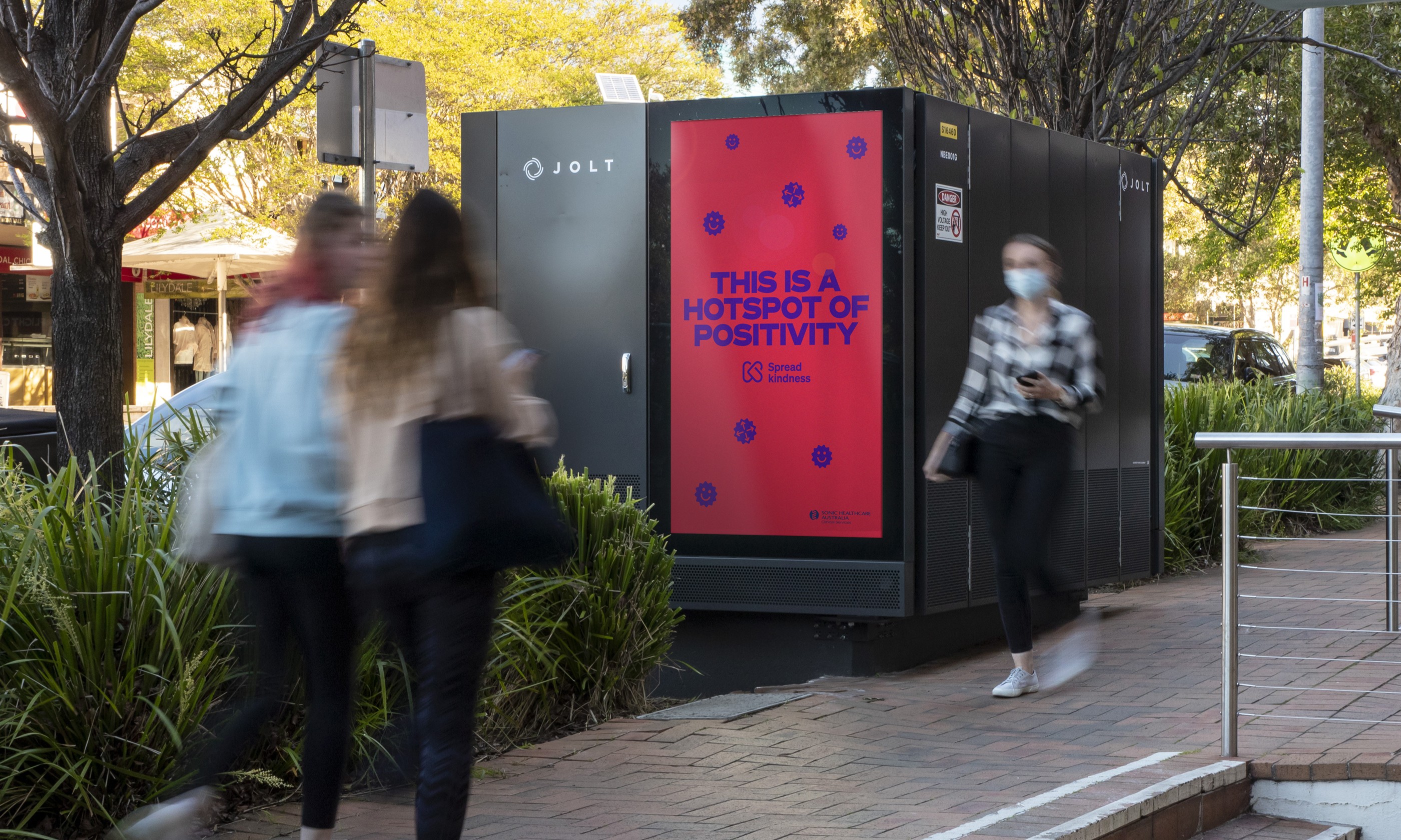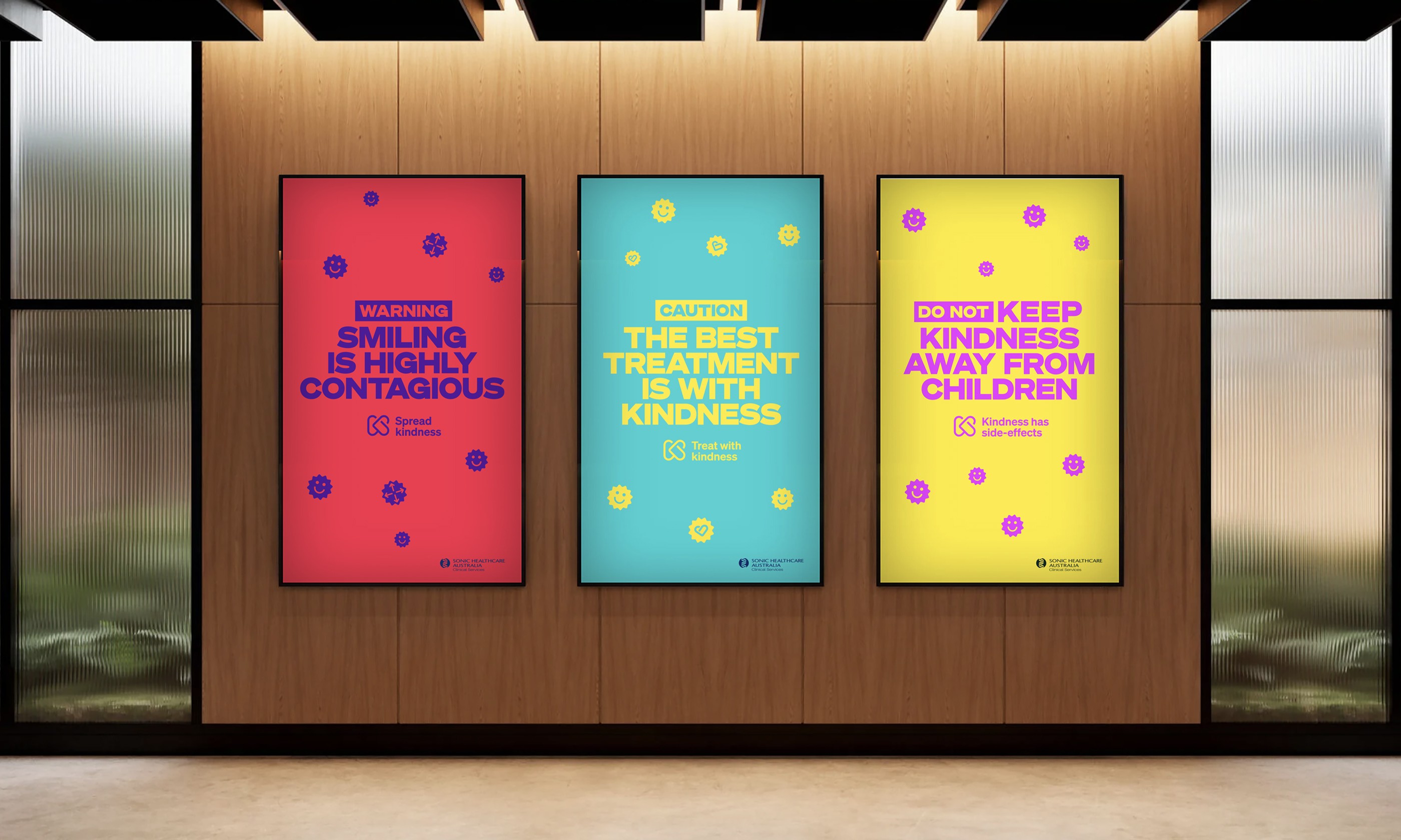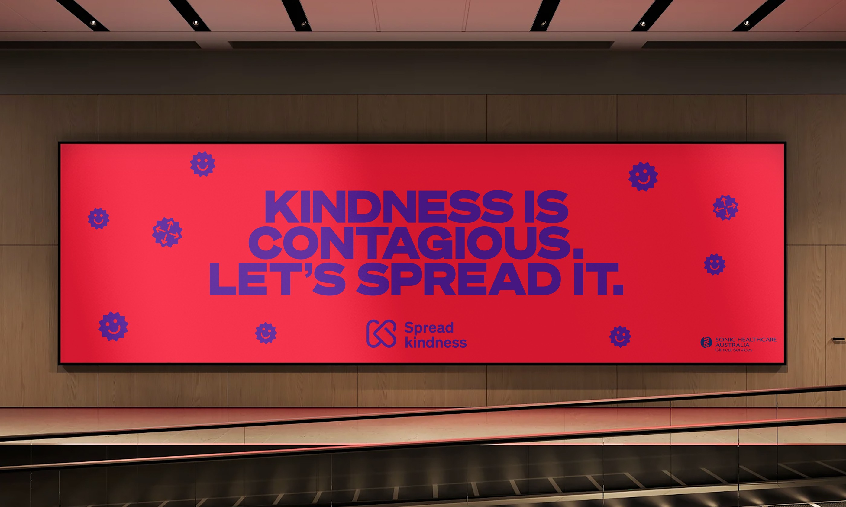 Through collaboration, we reframed the campaign brief as a behavioural opportunity — a chance to shift tone across the environment itself. Using the familiar codes of medical warning signage, we inverted caution into playful colour and humour, turning high-traffic spaces into cues for kindness. Even the spreading “virus” became a smiling symbol of positivity.